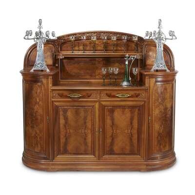 With shaped tripartite back, the center section framed with foliate carving above a demi-shelf, the paneled sides above curved conforming moulded cabinets, the center section with two drawers above two cabinet doors similarly moulded.