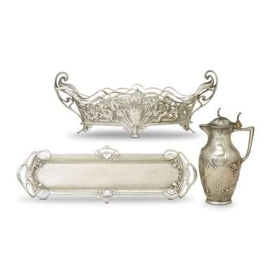 Including glass-lined two-handled bowl, pitcher, and tray. The bowl and tray marked: "WMF as I/0" The jug marked: "B WMF I/0 as"