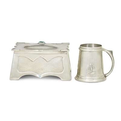 English pewter jewelry casket and "Tudric" mug the mug Archibald Knox for Liberty & Co., London, circa 1905