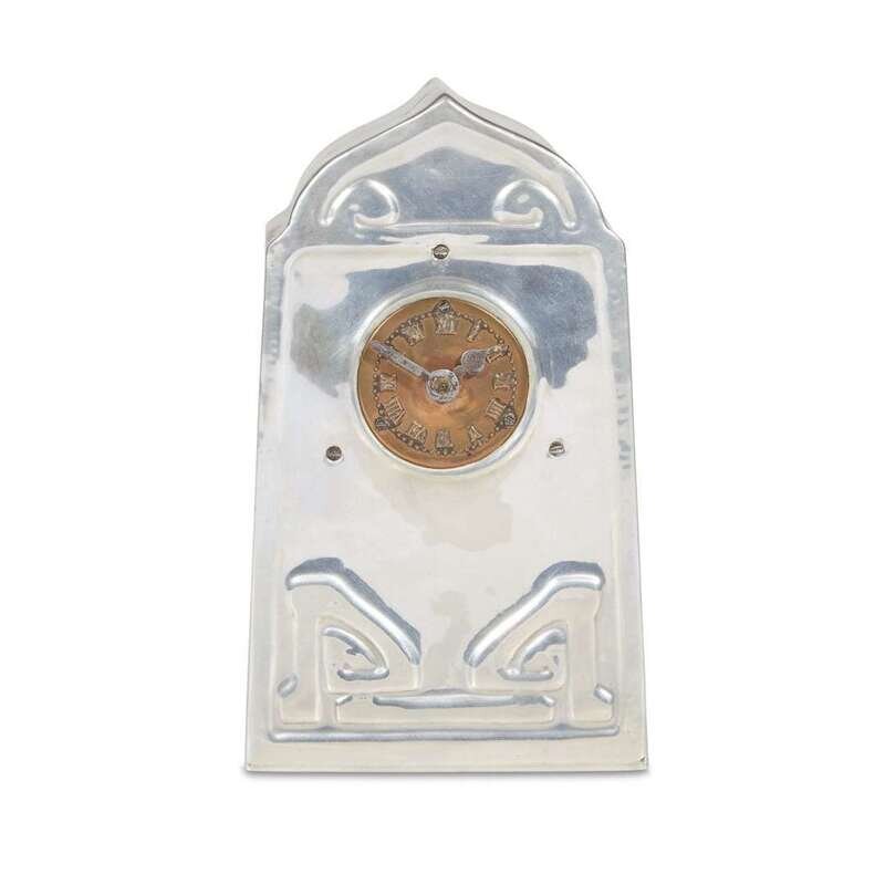 A diminutive British Arts & Crafts pewter and copper clock attributed to Archibald Knox for Liberty & Co., circa 1910