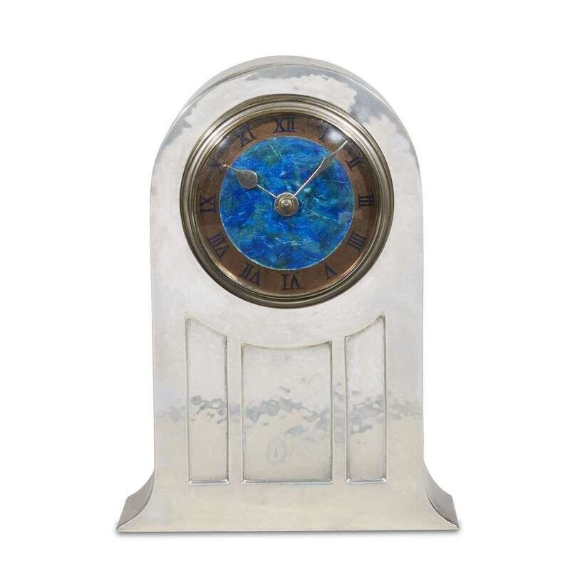 A "Tudric" enameled pewter and copper clock Liberty & Co., London, circa 1905