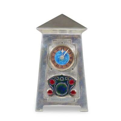 An enameled pewter and copper "Tudric" clock Archibald Knox for Liberty & Co., London, circa 1902