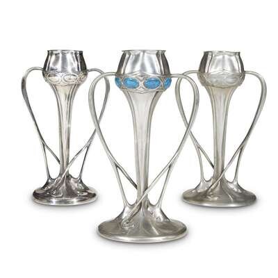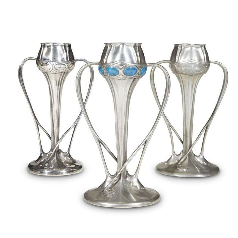 Two in pewter (one with enamel), the other silverplate Silverplate vase with impressed mark: "2 TUDRIC 029" Enameled vase with impressed mark: "4 TUDRIC 029"