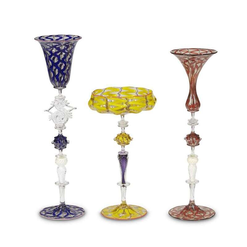 Charles Paul Savoie (American, b. 1959) Three Zanfirico glass goblets, circa 2000