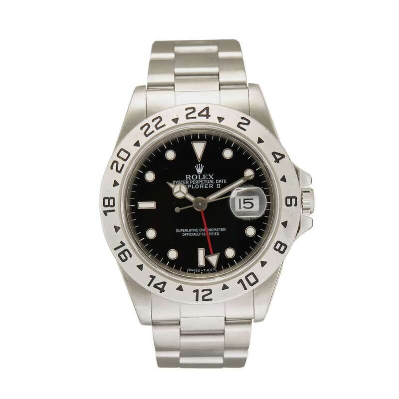 Rolex Explorer II Ref.16570 circa 1998 self-winding automatic watch, features a 40mm stainless steel case surrounding a black dial on a stainless steel oyster bracelet with folding buckle. Functions include hours, minutes, seconds, date and GMT. This watch comes with box only.