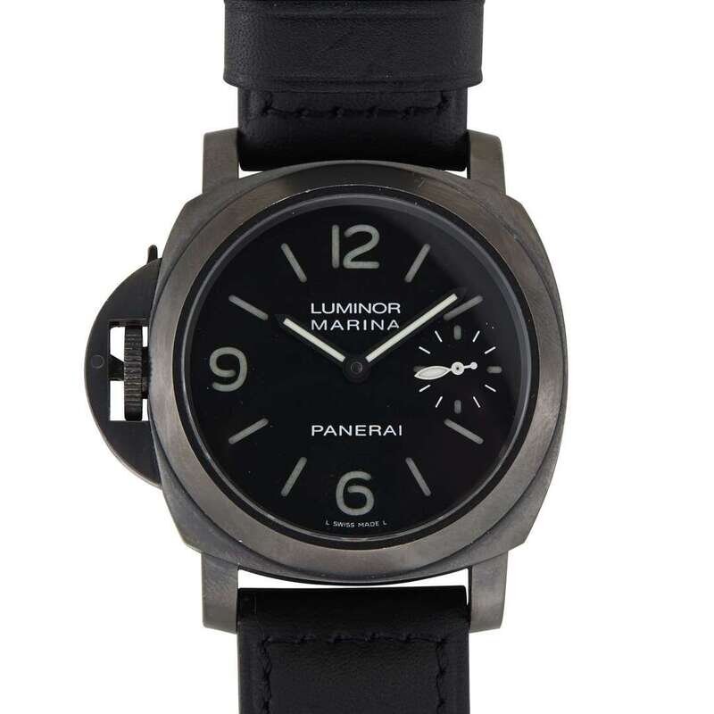 Panerai Luminor Marina PAM 0026 circa 2010 manual-wind watch, features a 44mm black PVD coated case surrounding a black dial on a black leather strap with black PVD coated tang buckle. Functions include hours, minutes, and small-seconds. This watch comes complete with box and papers. Limited Edition of 1000 Pieces.