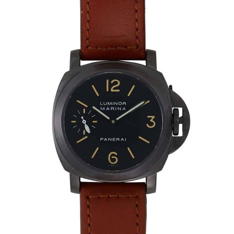 Panerai Luminor Marina PAM 0004 circa 1990 manual-wind watch, features a 44mm PVD coated stainless steel case surrounding a black dial on a tan leather strap with a PVD coated stainless steel tang buckle. Functions include hours, minutes, and small-seconds. This watch comes complete with box, papers, and Panerai service papers.