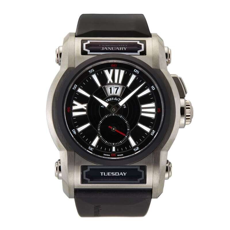 Maitres Du Temps Chapter Two Ref.C2R.TT0.21.120 circa 2012 self-winding automatic watch, features a 45mm x 32mm titanium case surrounding a black dial on a black rubber strap with a titanium deployment buckle. Functions include hours, minutes, seconds, day, date and month. This watch comes with box and papers.