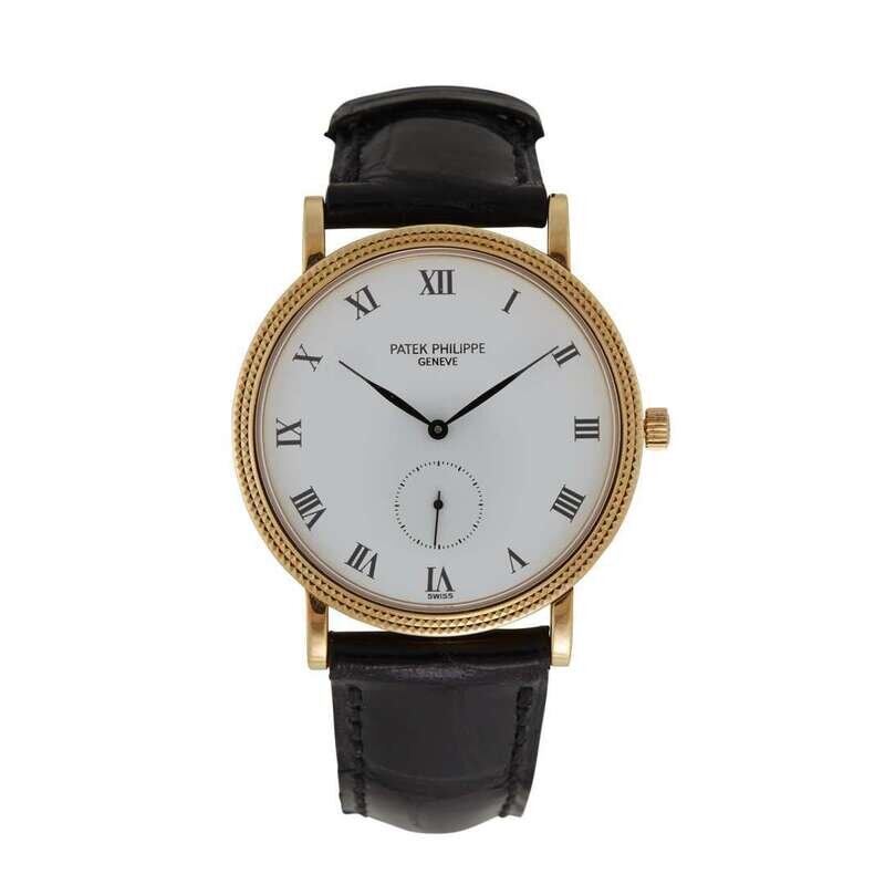 Patek Philippe Calatrava Ref.3919J circa 1990 manual-wind watch, features a 34mm 18k yellow gold case surrounding a white dial on a black alligator strap with 18k yellow gold tang buckle. Functions include hour, minutes, and small-seconds. This watch comes with box only.