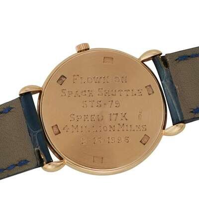 The caseback is engraved "FLOWN ON SPACE SHUTTLE STS-79 SPEED 17K 4 MILLION MILES 9.16.1996"