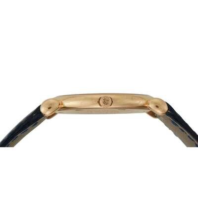 Patek Philippe Calatrava Ref. 3820R circa 1994 manual-wind watch, features a 32mm 18k rose gold case (with engraving on the caseback) surrounding a cream dial on a blue alligator Patek Philippe strap with an 18k rose gold deployment buckle. Functions include minutes and hours. This watch comes with a Patek Philippe Certificate of Origin.