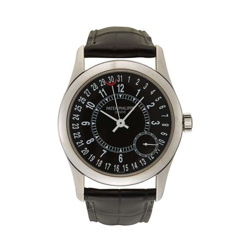 Patek Philippe Calatrava Ref.6000G-001 circa 2000 self-winding automatic watch, features a 37mm 18k white gold case surrounding a black dial on a black crocodile strap with an 18k white gold deployment buckle. Functions include hours, minutes, small-seconds and date. This watch comes complete with box and papers.