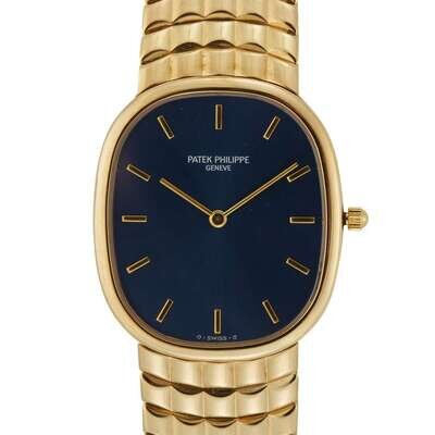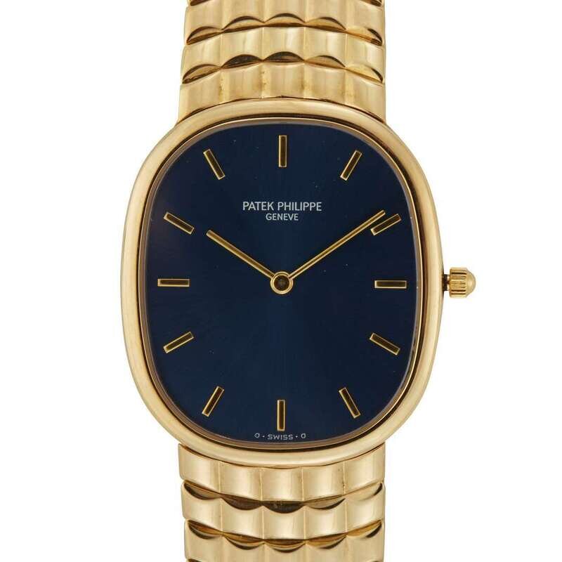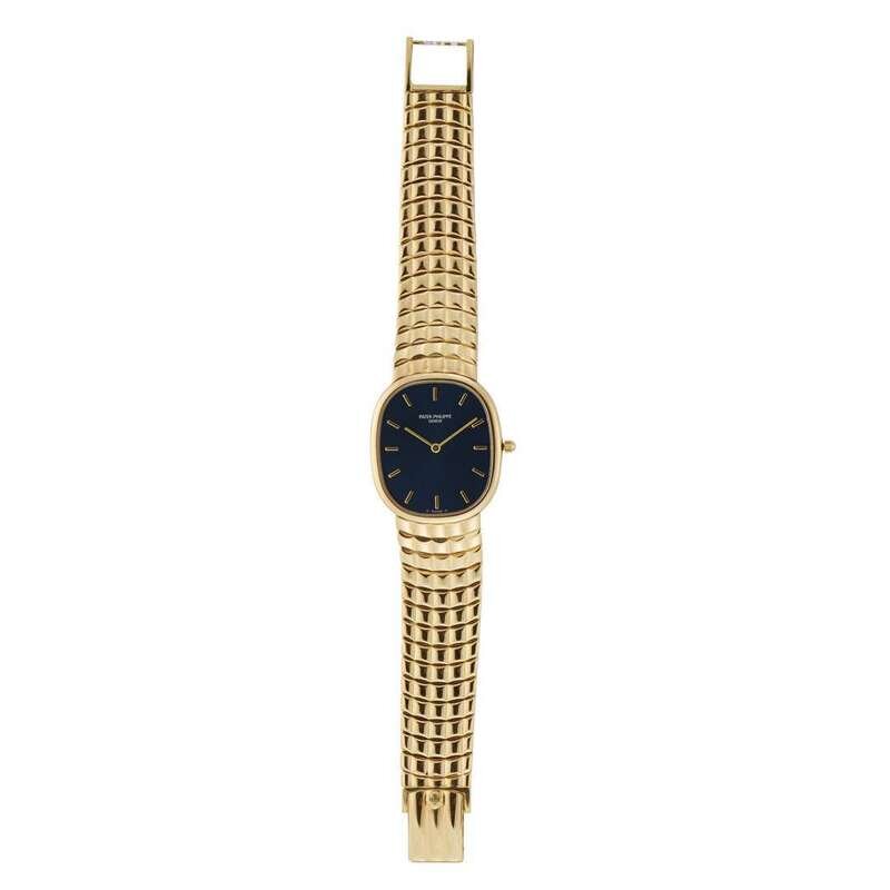 Patek Philippe Ellipse Ref.3738 circa 1990 self-winding automatic watch, features a 35mm x 31mm 18k yellow gold case surrounding a blue dial on an 18k yellow gold bracelet with folding buckle. This bracelet measures 6 1/2 inches. Functions include hours and minutes. This watch shows minor scratches on the caseback that cannot be polished. This watch does not come with box or papers.