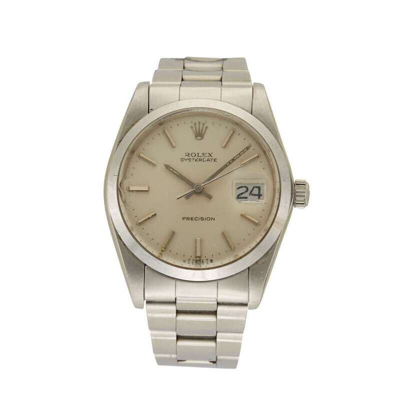 Rolex Oysterdate Ref.6694 circa 1982 manual-wind watch, features a 34mm stainless steel case surrounding a silver dial on a stainless steel oyster bracelet with a stainless steel folding clasp. Functions include hours, minutes, seconds and date. This watch does not come with box and papers.