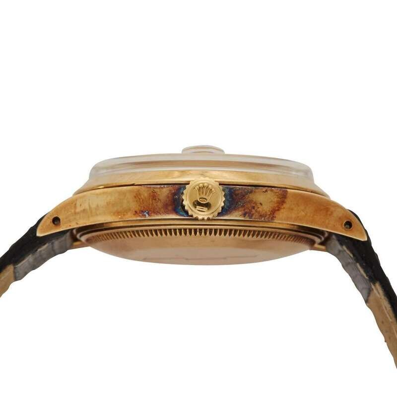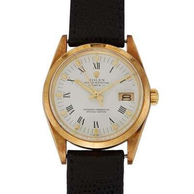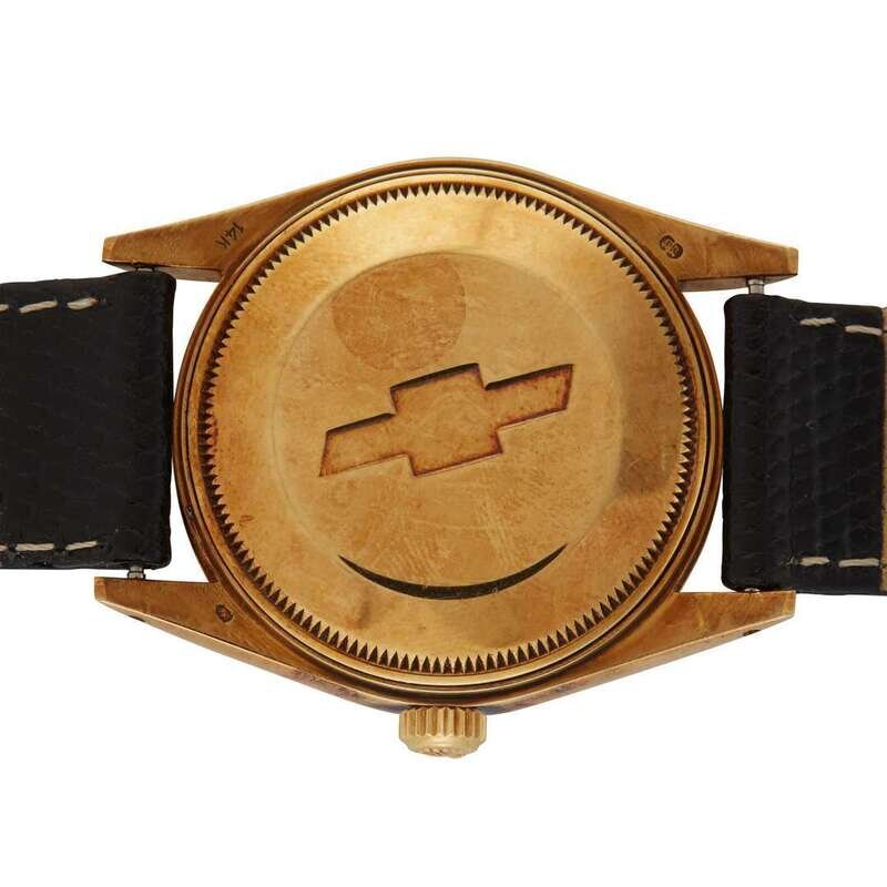Rolex Date Ref.15007 circa 1986 self-winding automatic watch, features a 34mm 14k yellow gold (with Chevrolet logo engraving on caseback) case surrounding a white dial on a black embossed leather strap with a stainless steel tang buckle. Functions include hours, minutes, seconds and date. This watch does not come with box and papers.