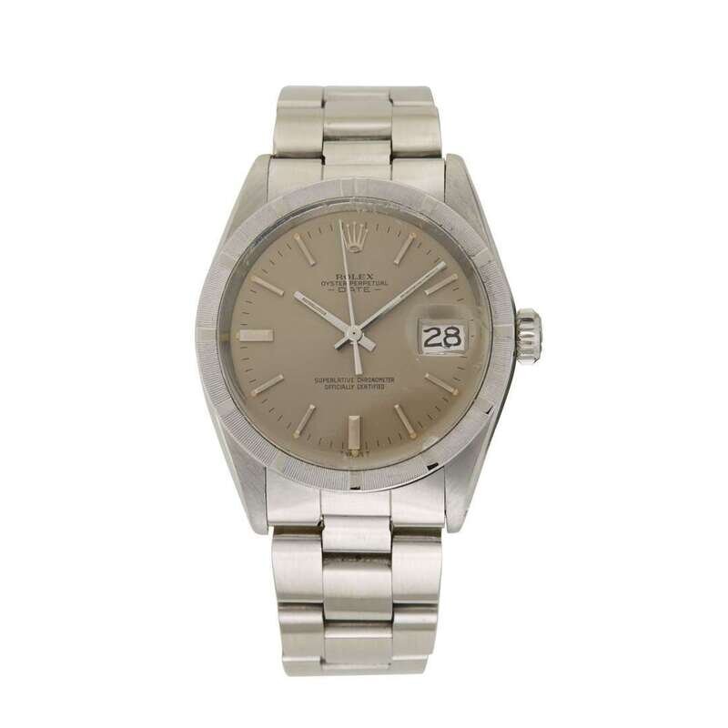 Rolex Date Ref.1501 circa 1969 self-winding automatic watch, features a 34mm stainless steel case surrounding a grey dial on a stainless steel oyster bracelet with a stainless steel folding clasp. Functions include hours, minutes, seconds and date. This watch does not come with box and papers.