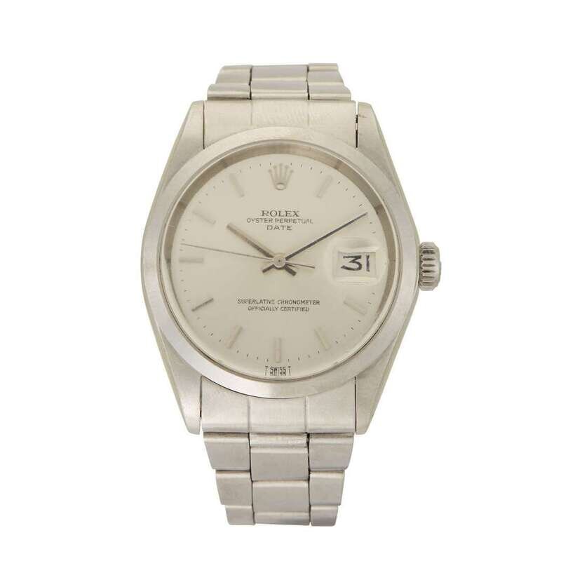 Rolex Oyster Perpetual Date Ref.1500 circa 1967 self-winding automatic watch, features a 34mm stainless steel case surrounding a silver dial on a stainless steel oyster bracelet with a stainless steel folding clasp. Functions include hours, minutes, seconds and date. This watch does not come with box and papers.