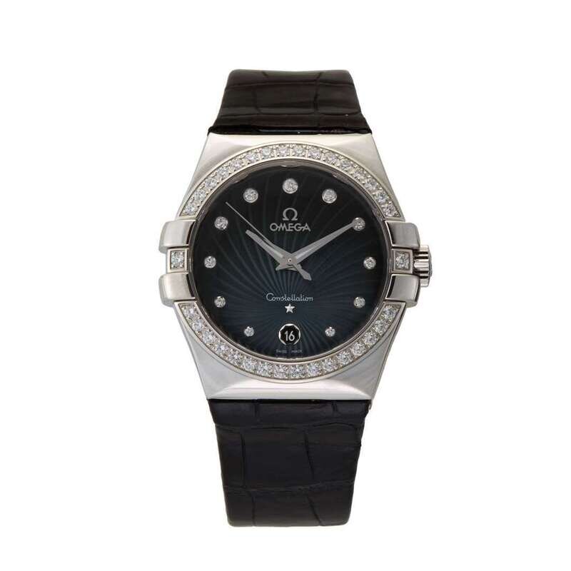 Omega Constellation Ref.123.18.35.60.56.001 quartz watch, features a 35mm stainless steel case with diamond bezel surrounding a grey diamond dial on a black crocodile strap with a stainless steel deployment buckle. Functions include hours, minutes, seconds and date. This watch comes complete with box and papers.