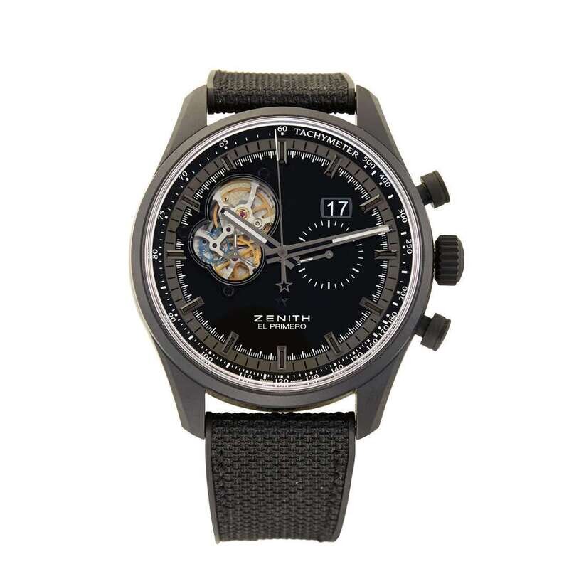 Zenith El Primero Chronomaster Night Vision Ref.24.2160.4068/21.R573 circa 2010 self-winding automatic watch, features a 45mm ceramic case surrounding a black skeletonized dial on a black canvas strap with a ceramic deployment buckle. Functions include hours, minutes, small-seconds, date, chronograph and tachymeter. This watch comes complete with box and papers.