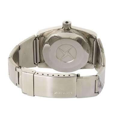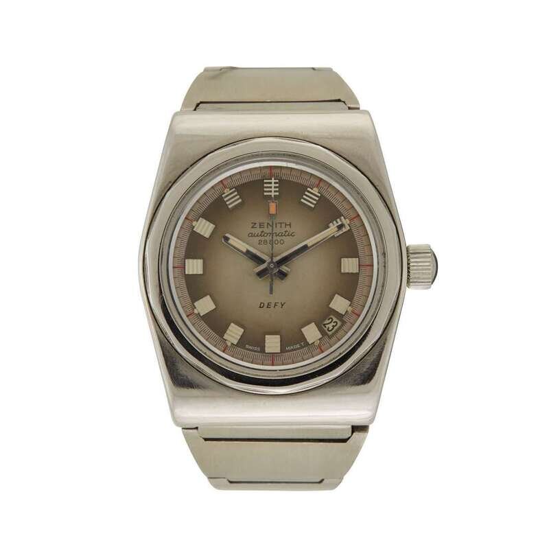 Zenith Defy Ref.A 7681 circa 1970 self-winding automatic watch, features a 38mm stainless steel case surrounding a gradient gray dial on a stainless steel bracelet with a stainless steel folding clasp. Functions include hours, minutes, seconds and date. This watch does not come with box and papers.