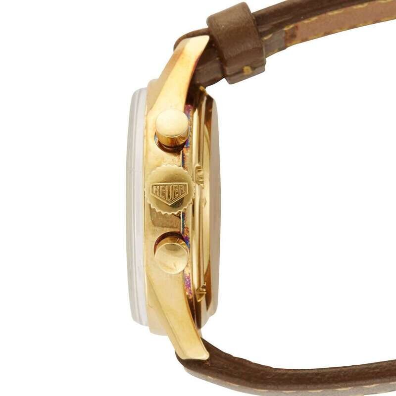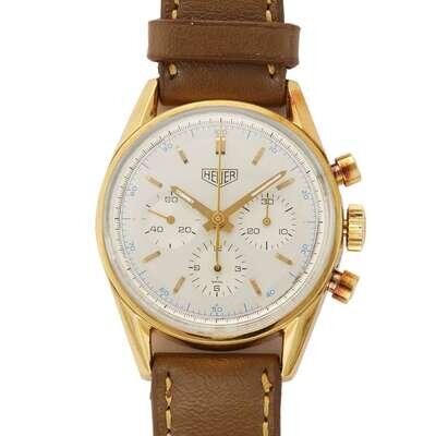 Tag Heuer Carrera (1964 Heuer re-edition) circa 1996 self-winding automatic watch, features a 36mm 18k yellow gold case surrounding a silver dial on a brown leather strap with a steel tang buckle. Functions include hours, minutes, seconds, chronograph and tachymeter. This watch comes with box and papers.