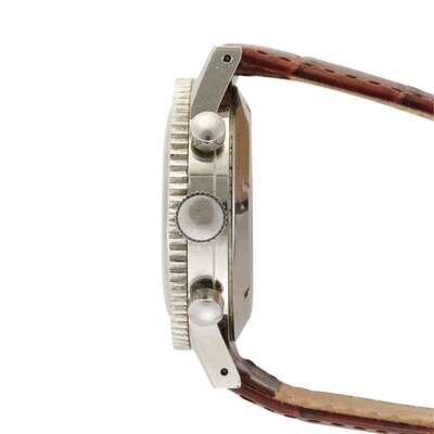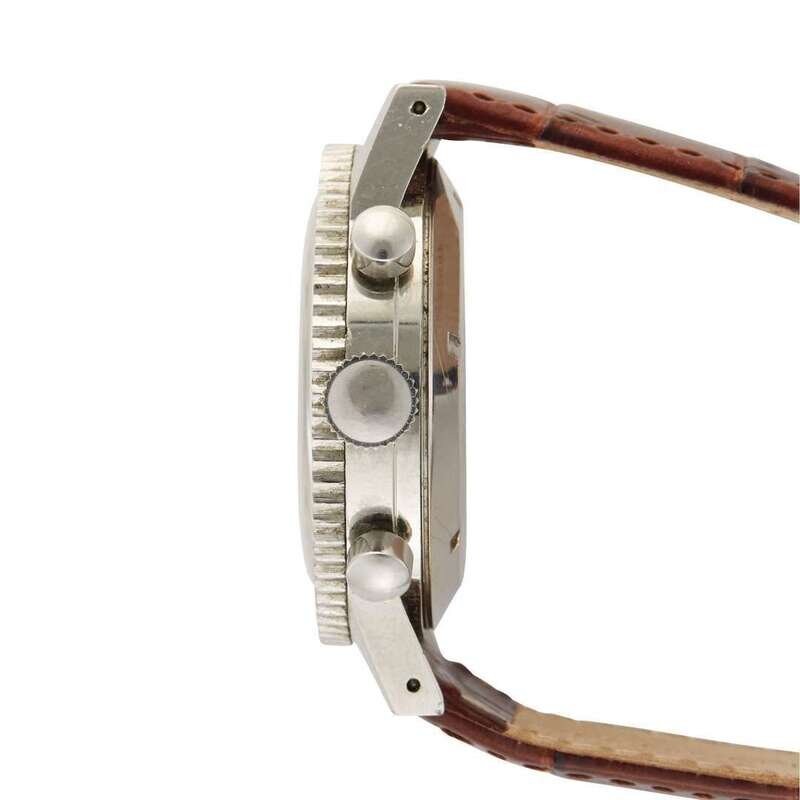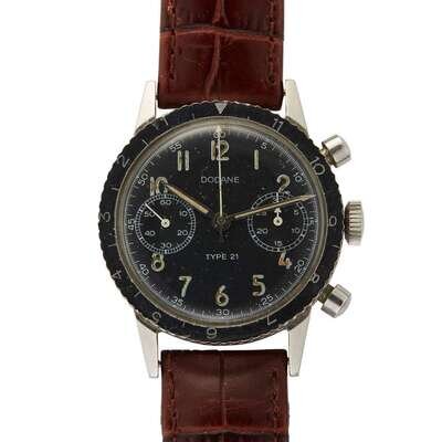 Dodane Type 21 circa 1960 manual-wind watch, features a 38mm stainless steel case surrounding a black dial on a brown embossed leather strap with a stainless steel tang buckle. Functions include hours, minutes, seconds, and chronograph. This watch does not come with box and papers.