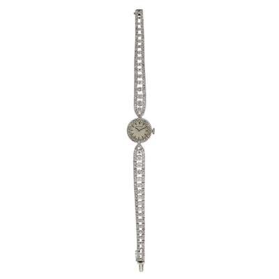 Jaeger LeCoultre jeweled movement no. 1992078 circa 1950 in eighteen karat white gold case, bezel and later added fourteen karat white gold bracelet set with full and single-cut diamonds, estimated total diamond weight: 3.20 carats.