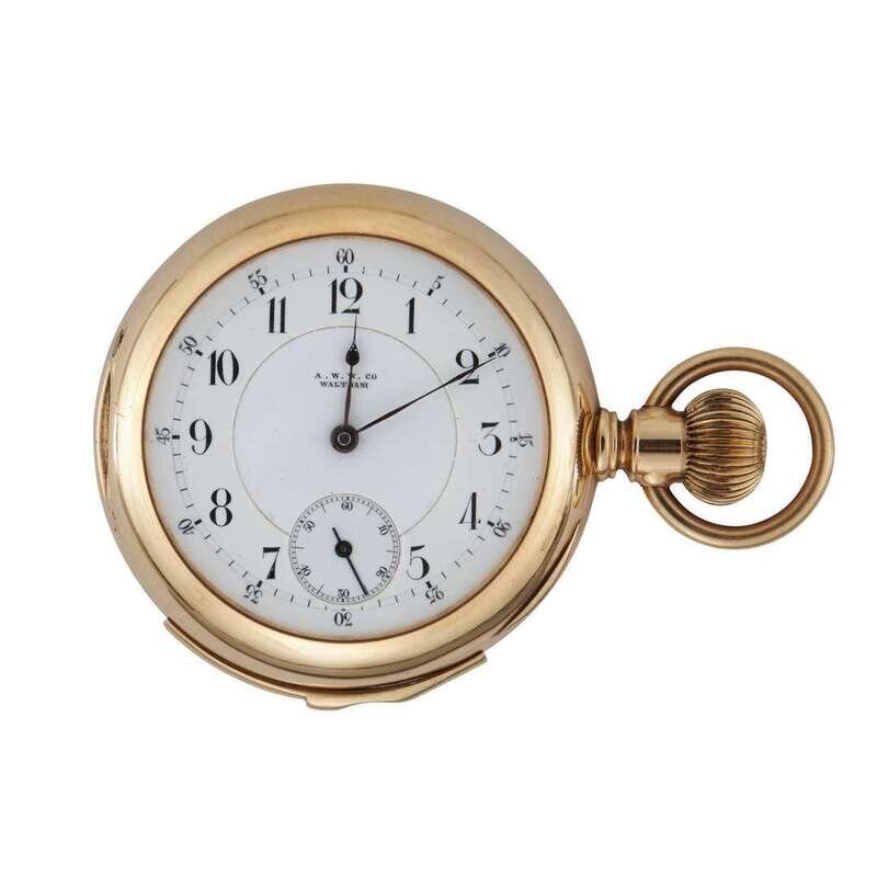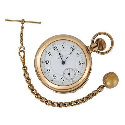 14k gold open face pocket watch movement no. 3793577 jeweled to the center, case, dial and movement signed for Waltham, double sunk dial and subsidiary seconds accompanied by diamond and 18k gold watch chain.