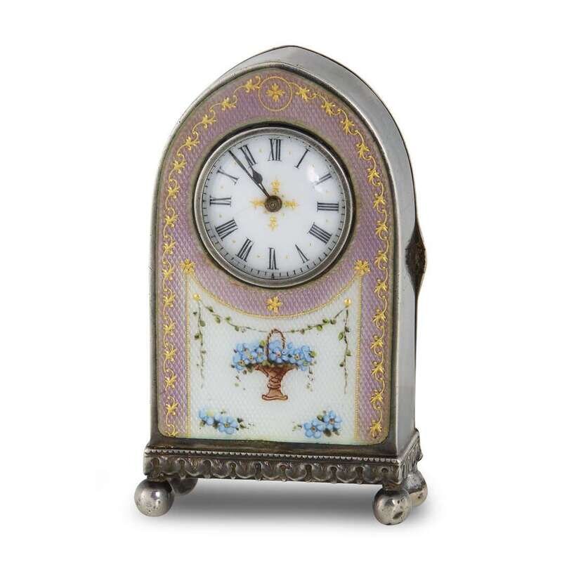 Sterling Silver Cartier desk clock, European Watch & Clock Co. movement, key wind, key set with enamel decorated case front, hinged case back signed "Cartier Paris European Watch & Clock Co. 21678" with European hallmarks.
