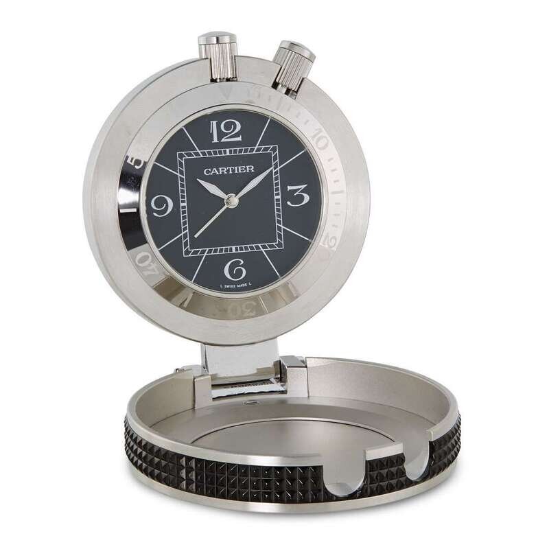 Cartier Pasha Clock Ref.W0100058 circa 2010 quartz travel clock, features a 66mm stainless steel case surrounding a black dial. Functions include hours, minutes and alarm. This clock comes with box, manual and service papers.