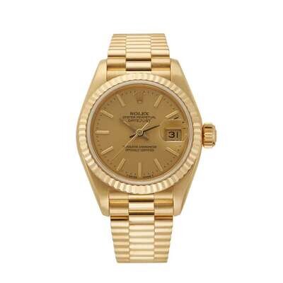 Rolex Datejust Ref.69178 circa 1990 self-winding automatic watch, features a 26mm 18k yellow gold case surrounding a champagne dial on an 18k yellow gold president bracelet with folding buckle. Functions include hours, minutes, seconds, and date. This watch does not come with box and papers.