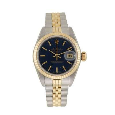 Rolex Datejust Ref.69173 circa 1988 self-winding automatic watch, features a 26mm stainless steel and 18k yellow gold case with fluted bezel surrounding a blue dial on a stainless steel and 18k yellow gold jubilee bracelet with folding buckle. Functions include hours, minutes, seconds and date. This watch comes with papers only.