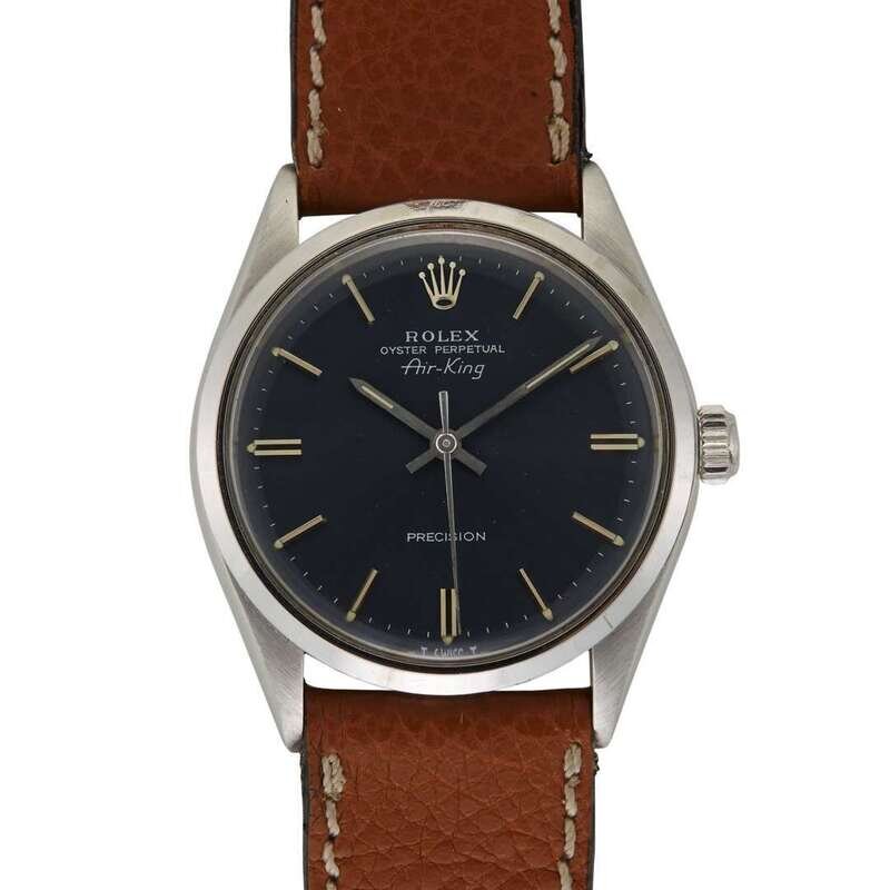 Rolex Air-King Ref.5500 circa 1971 self-winding automatic watch, features a 34mm stainless steel case surrounding a grey dial on a brown textured leather strap with a stainless steel tang buckle. Functions include hours, minutes and seconds. This watch does not come with box and papers.