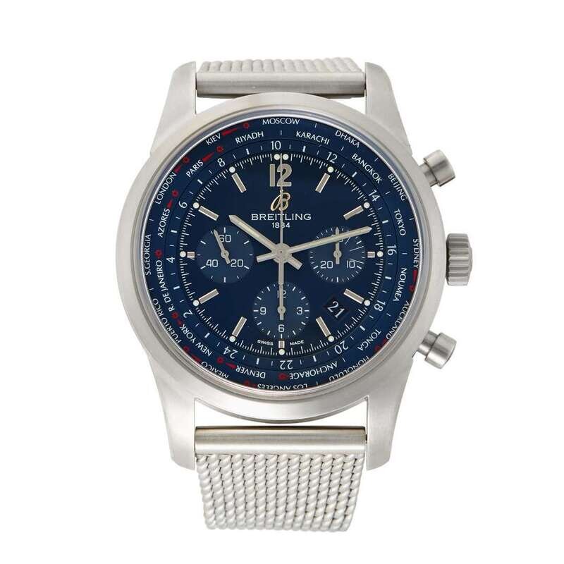Breitling Transocean Chronograph Unitime Pilot Ref.AB0510U9/C879 circa 2010 self-winding automatic watch, features a 46mm stainless steel case surrounding a blue dial on a stainless steel mesh bracelet with folding buckle. Functions include hours, minutes, small-seconds, date, chronograph and world-time. This watch comes complete with box and papers.