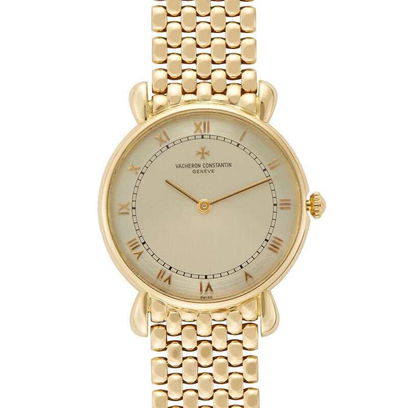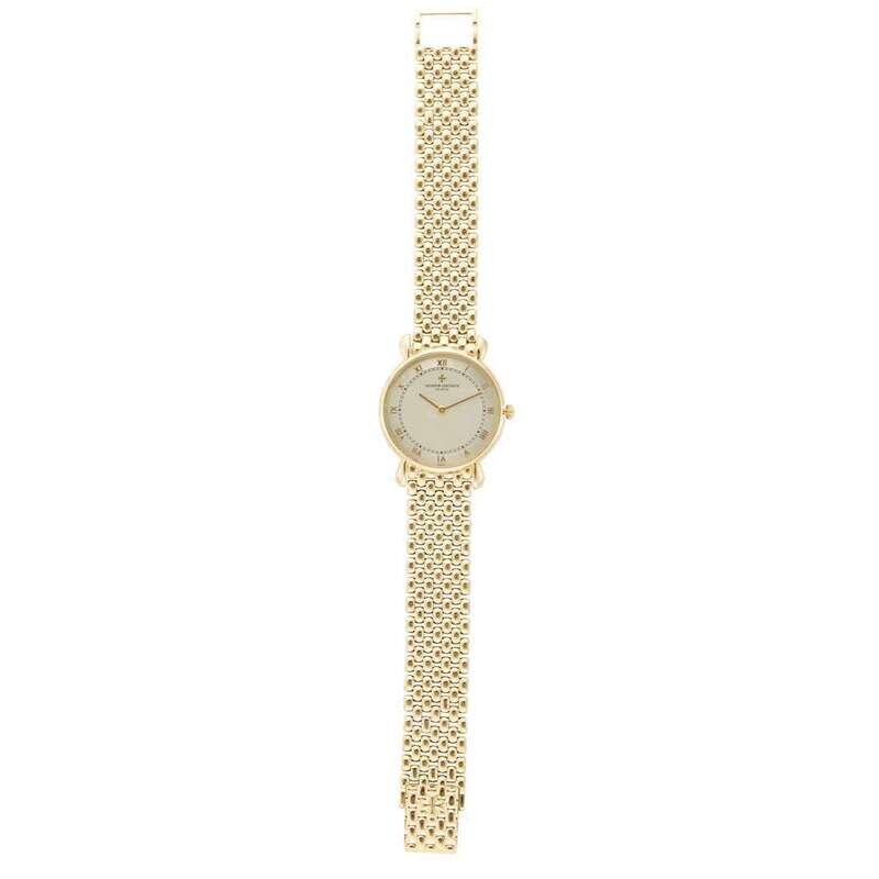 Vacheron & Constantin Ref.33084 circa 1991 manual-wind watch, features a 31mm 18k yellow gold case surrounding a two-tone silver dial on a 18k yellow gold bracelet with a 18k yellow gold clasp. Functions include hours and minutes. This watch comes with box and papers.