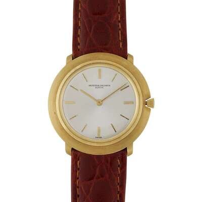 Vacheron Constantin Ref.6335 circa 1960 manual-wind watch, features a 34mm 18k yellow gold case surrounding a silver dial on a cognac alligator strap with a yellow gold plated tang buckle. Functions include hours and minutes. This watch does not come with box or papers.