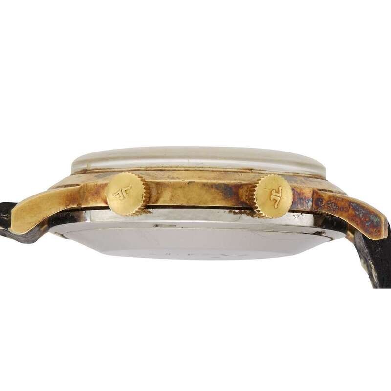 Gubelin by Jaeger-LeCoultre IpsoVox circa 1956 self-winding automatic caliber 825 watch, features a 36mm 18k yellow gold with a stainless steel caseback case surrounding a silver dial on a black calf leather strap with a stainless steel tang buckle. Functions include hours, minutes, seconds, date and alarm. This watch does not come with box and papers.