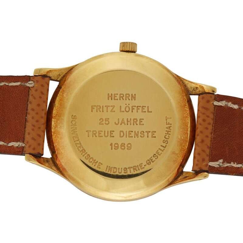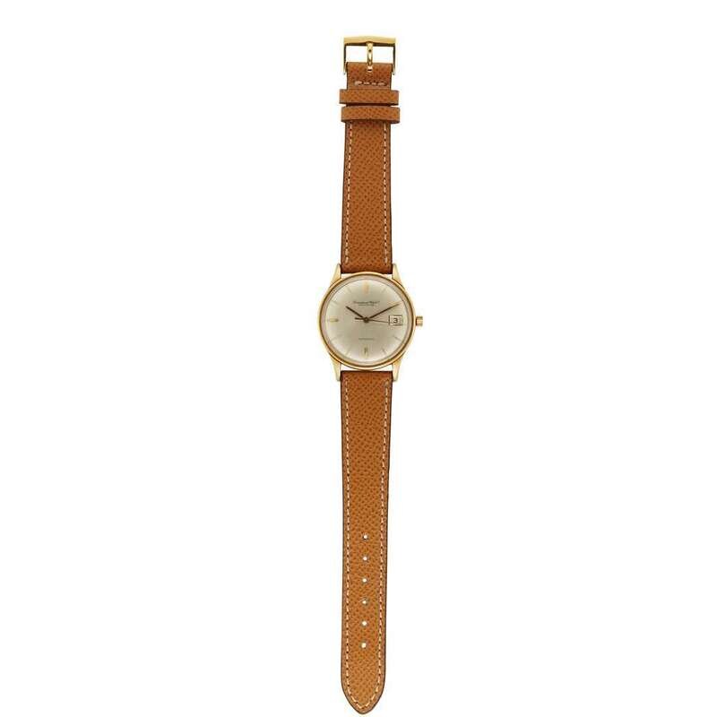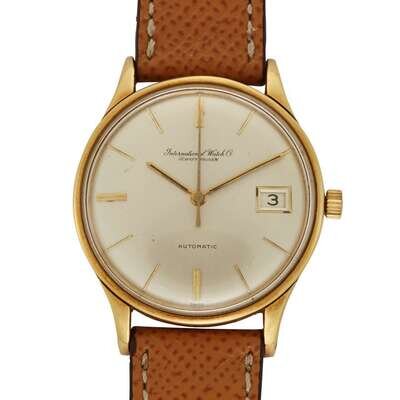 IWC circa 1960 self-winding automatic watch, features a 34mm 18k yellow gold case (with an engraving on the caseback) surrounding a silver dial on a tan textured leather strap with a gold plated tang buckle. Functions include hours, minutes, seconds and date. This watch does not come with box and papers.