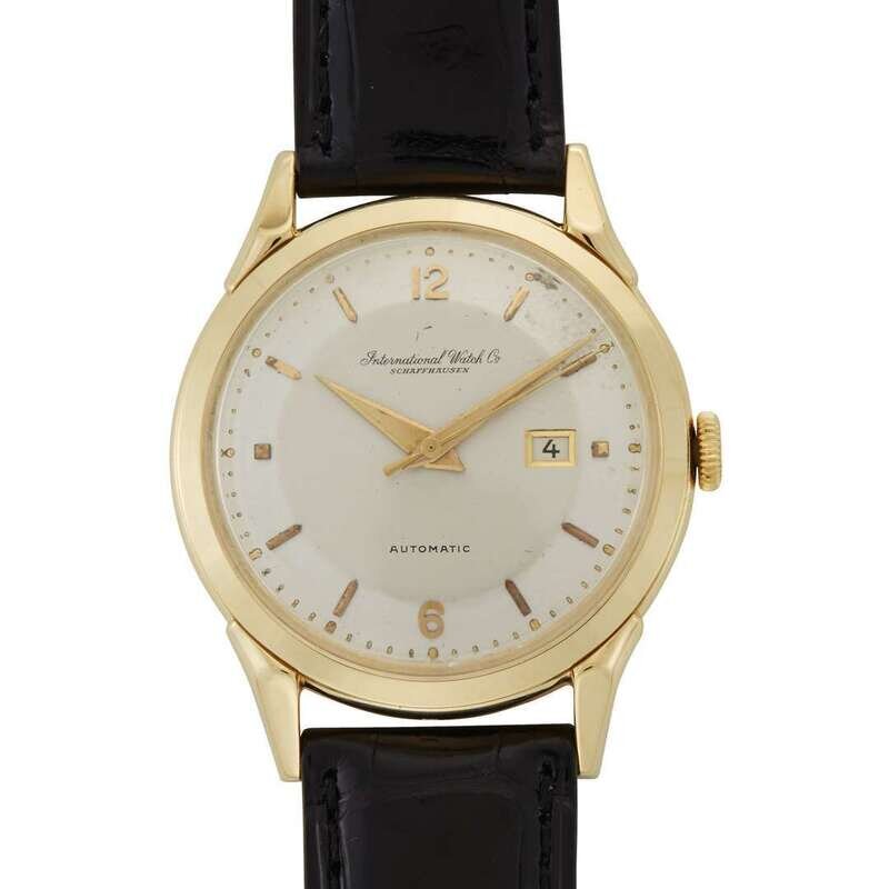 IWC circa 1950 self-winding automatic watch, features a 35mm 18k yellow gold case surrounding a silver dial on a black alligator strap with an 18k yellow gold tang buckle. Functions include hours, minutes, seconds and date. This watch comes with travel case only.