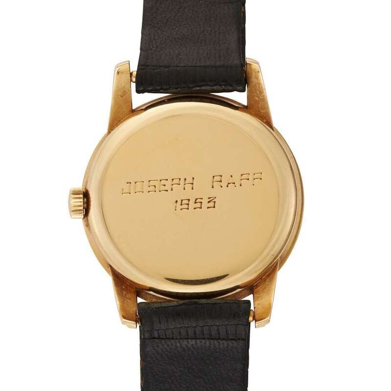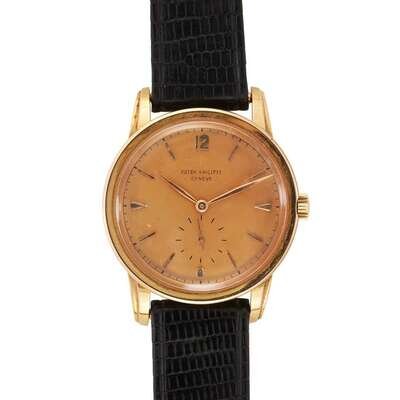 Patek Philippe Ref.2452 circa 1950 manual-wind watch, features a 36mm 18k rose gold case surrounding a rose dial on a black lizard strap with a stainless steel tang buckle. Functions include hours, minutes, and small seconds. This watch does not come with box and papers.
