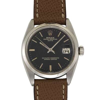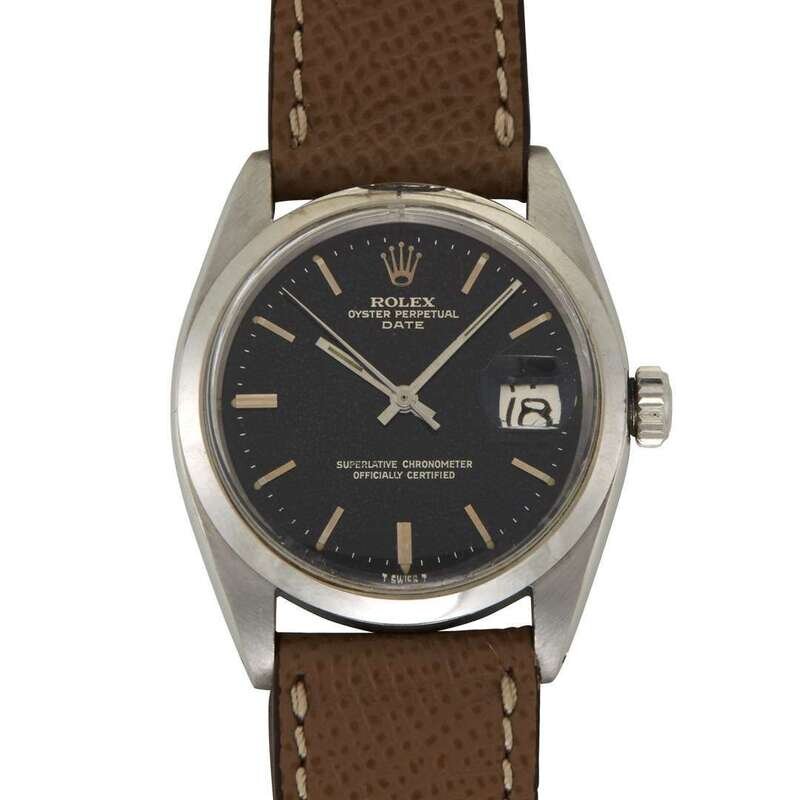 Rolex Date Ref.1500 circa 1960 self-winding automatic watch, features a 34mm stainless steel case surrounding a black dial on a taupe textured leather strap with a stainless steel tang. Functions include hours, minutes, seconds and date. This watch does not come with box and papers.