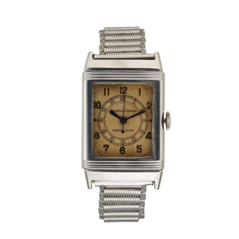 Jaeger-LeCoultre for Favre Leuba Reverso circa 1940 manual-wind watch, features a 23mm x 38mm (including lugs) stainless steel case surrounding a champagne with age related patina dial on a stainless steel bracelet. Functions include hours, minutes, and seconds. This watch does not come with box and papers.