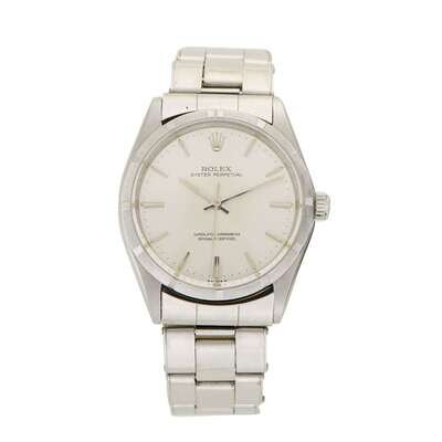 Rolex Oyster Perpetual Ref.1003 circa 1960 self-winding automatic watch, features a 34mm stainless steel case surrounding a silver dial on a stainless steel bracelet with a stainless steel folding clasp. Functions include hours, minutes, and seconds. This watch does not come with box and papers.
