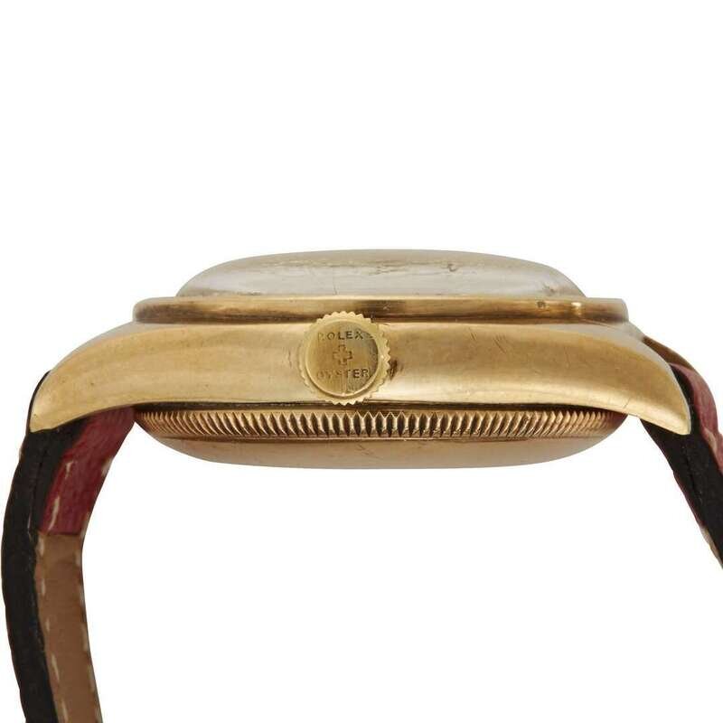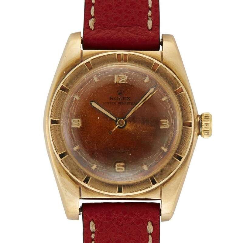Rolex Oyster Perpetual 'Bubbleback' Ref.5015 circa 1949 self-winding automatic watch, features a 32mm 14k yellow gold case surrounding a brown tropical dial on a red calf leather strap with a gold plated tang buckle. Functions include hours, minutes, and seconds. This watch does not come with box and papers.
