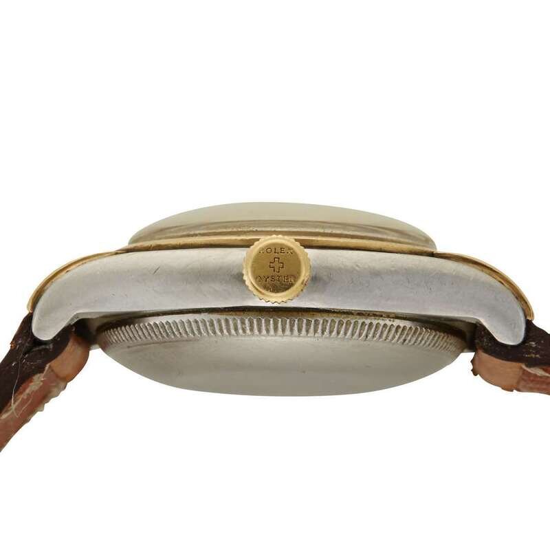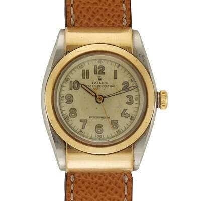 Rolex Oyster Perpetual 'Bubbleback' Ref.3065 circa 1949 self-winding automatic watch, features a 32mm 18k yellow gold and stainless steel with hooded lugs case surrounding a silver with age related patina dial on a tan calf leather strap with a stainless steel tang buckle. Functions include hours, minutes, and seconds. This watch does not come with box and papers.