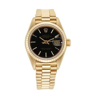 Rolex Ladies Datejust Ref.69178 circa 1986 self-winding automatic watch, features a 26mm 18k yellow gold case surrounding a black dial on an 18k yellow gold president bracelet with folding buckle. Functions include hours, minutes, seconds, and date. This watch comes complete with box and papers.