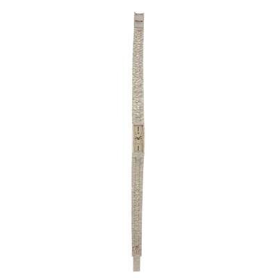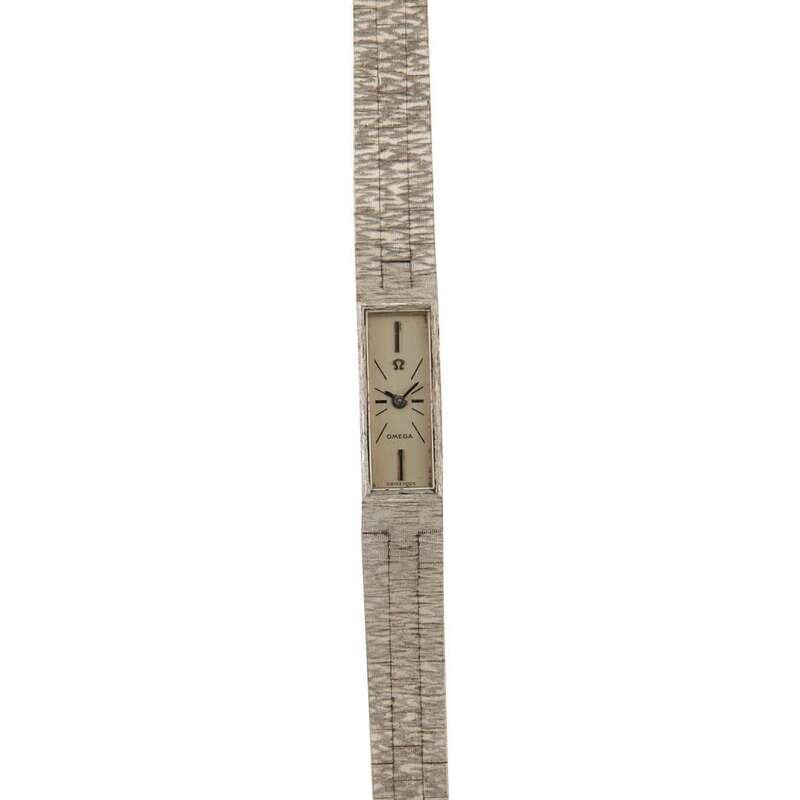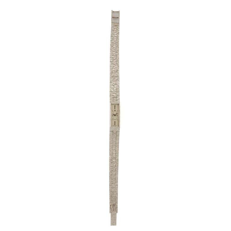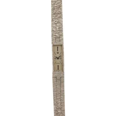 Omega Ladies circa 1960 manual-wind watch, features a 10mm x 2mm 18k white gold case surrounding a silver dial on a 18k white gold integrated bracelet with a 18k white gold clasp. Functions include hours and minutes. This watch does not come with box and papers.
