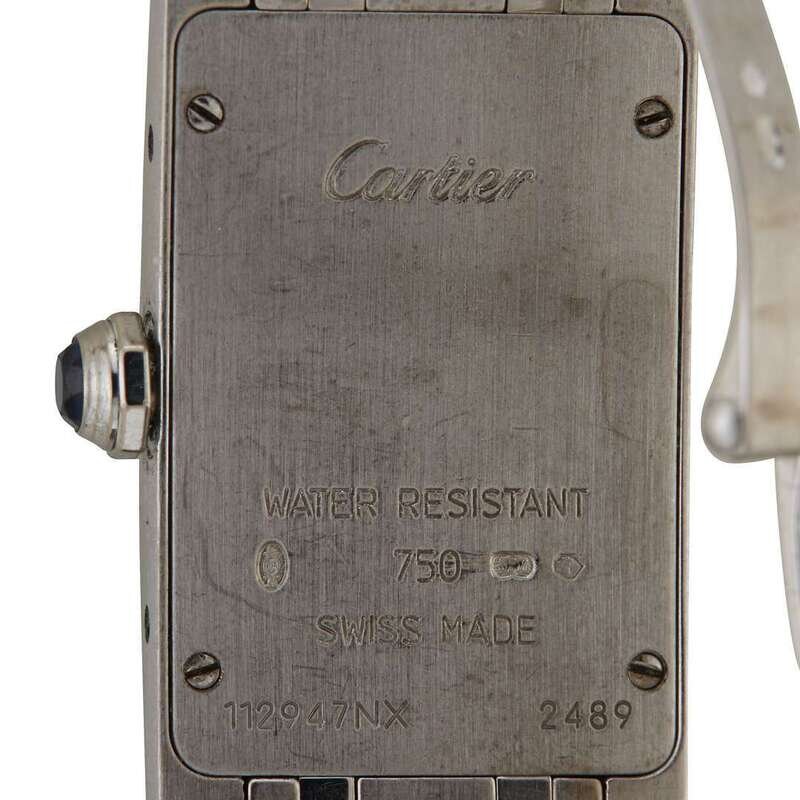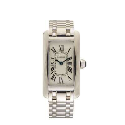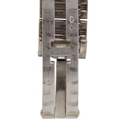Cartier Ladies Tank Americaine Ref.2489 circa 1995 quartz watch, features a 19mm x 35mm 18k white gold case surrounding a white dial on a 18k white gold bracelet with a 18k white gold butterfly clasp. This bracelet measures 6 inches. Functions include hours and minutes. This watch does not come with box and papers.