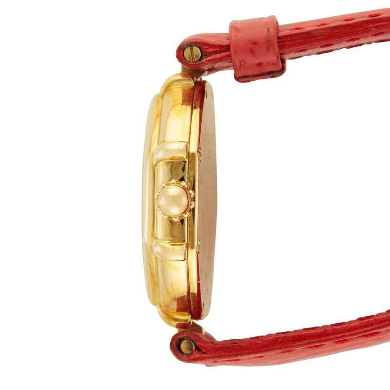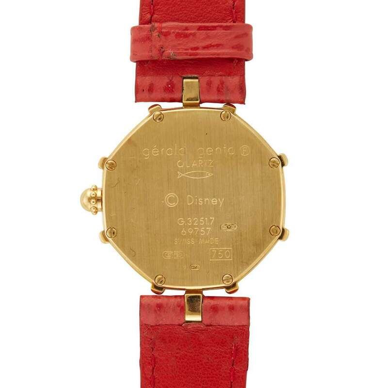 Gerald Genta Daisy Duck Ref.G3251.7 circa 2000 quartz watch, features a 28mm 18k yellow gold case surrounding a mother-of-pearl featuring Disney's Daisy Duck dial on a red leather Gerald Genta strap with a 18k yellow gold Gerald Genta tang buckle. Functions include hours and minutes. This watch comes with box and papers.