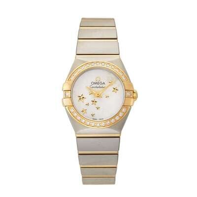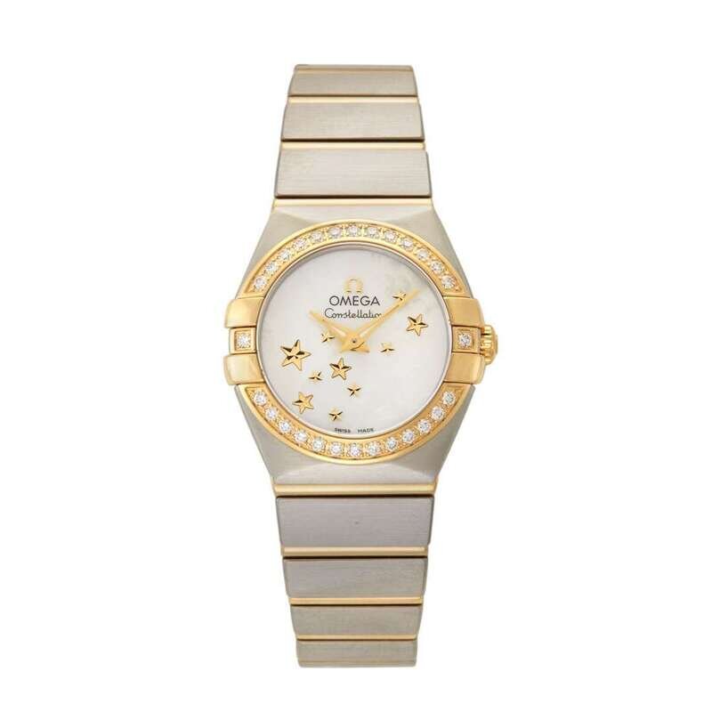 Omega Constellation Ref.123.25.24.60.05.001 circa 2000 quartz watch, features a 24mm stainless steel and 18k yellow gold case with diamond bezel surrounding a mother-of-pearl dial on a stainless steel and 18k yellow gold bracelet with folding buckle. Functions include hours and minutes. This watch comes complete with box and papers.